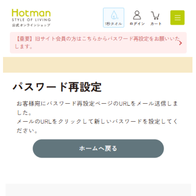 ②先ほど、ご入力いただきましたメールアドレス宛に「【Hotman】パスワード変更のお知らせ」というメールが届きますので、メール内のURLをクリックしてパスワード再設定ページへアクセスください。