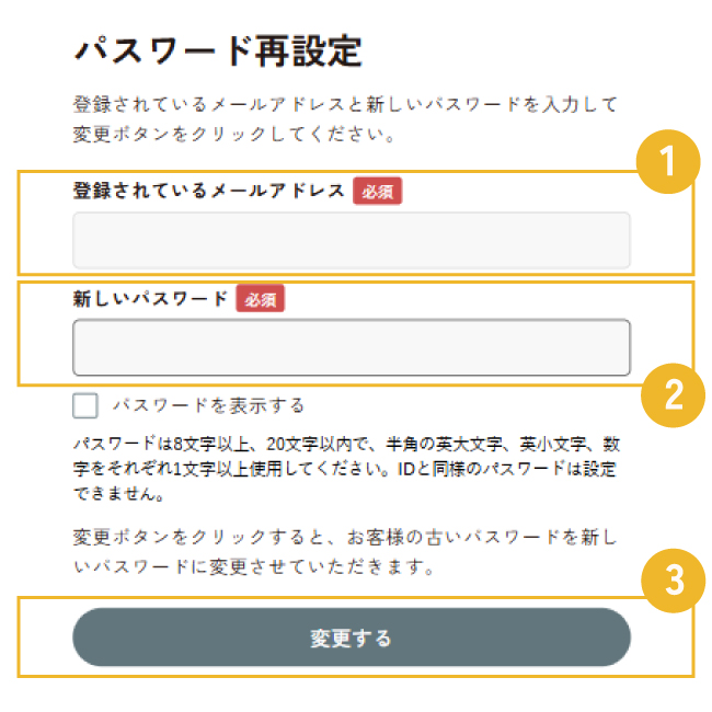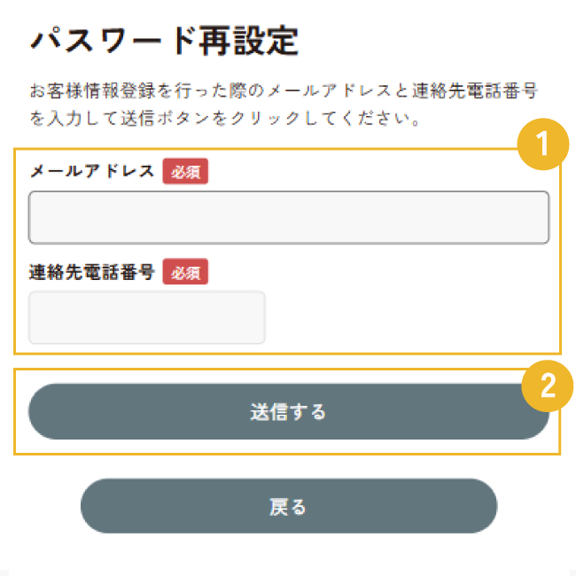 ①ご登録いただいていたメールアドレスと電話番号をご入力ください。