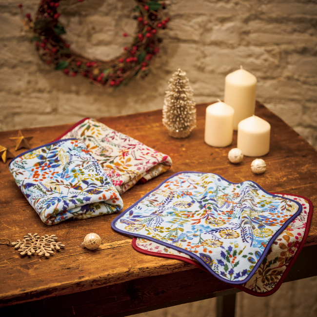 ユーカリやモミ、ヒイラギのほかサンキライの実など、クリスマスのリースに使われることが多い植物をデザインに取り入れた、ウィンターシーズンおすすめの<1秒タオル>です。お部屋の中やバスルームの季節感がぐっと高まります♪