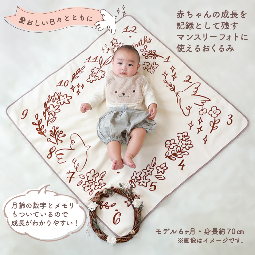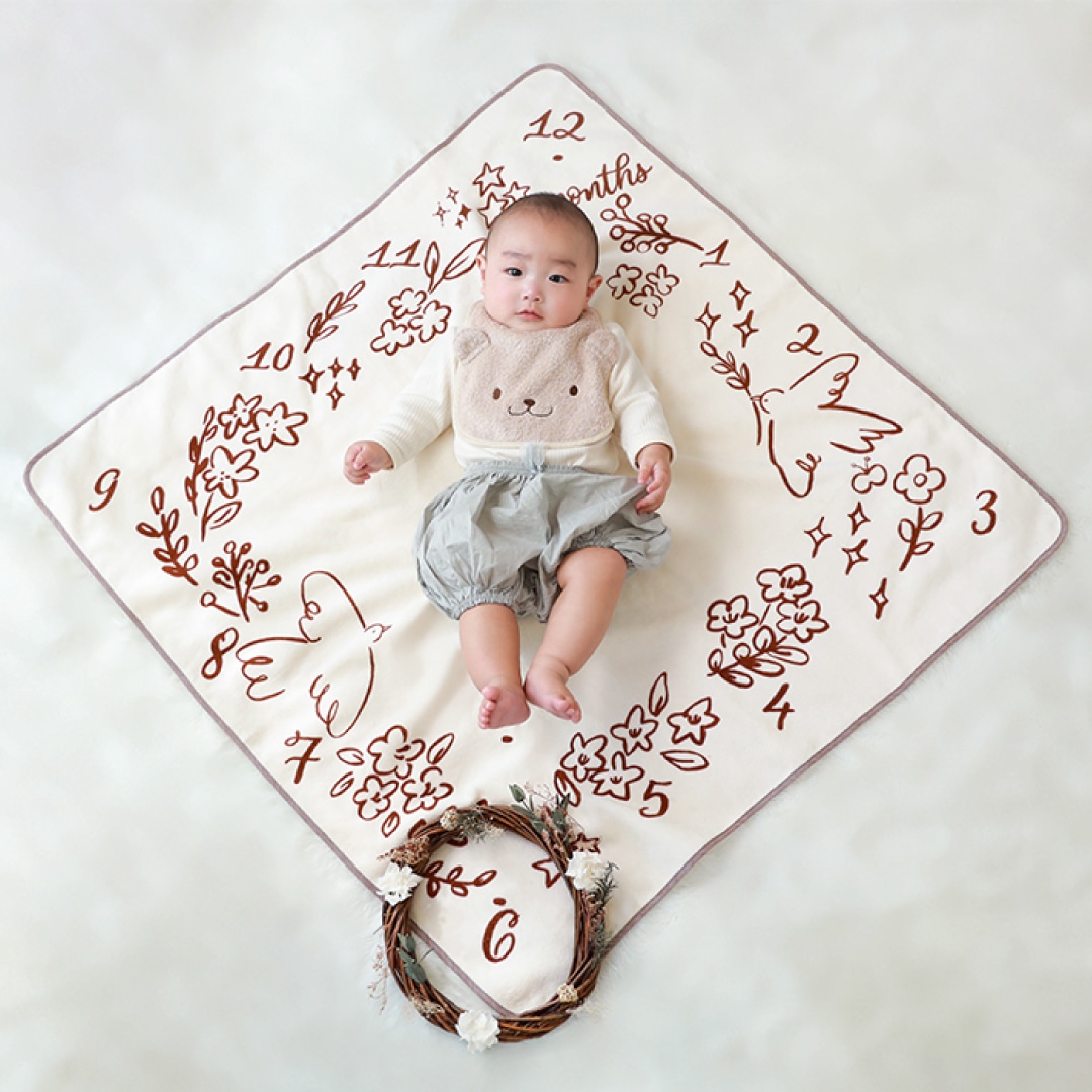 一生のうちで最も成長する時期は新生児から2歳ごろまでとの事。その貴重な成長を記録に残せるマンスリーフォト用にお使いいただけるおくるみをご用意しました。