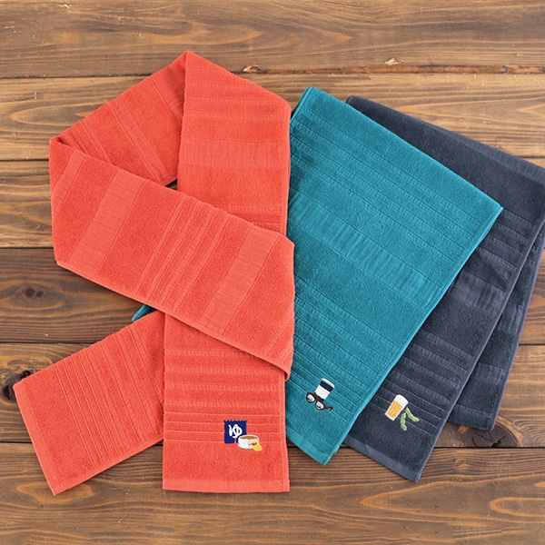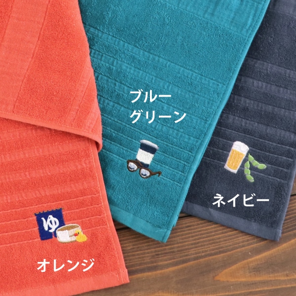 どれにしようか悩んでしまう、ちょっと笑えるワンポイント刺繍のウォーキングタオル。ビールと枝豆のネイビー、タンブラーとサングラスのブルーグリーン、温泉セットのオレンジです。
