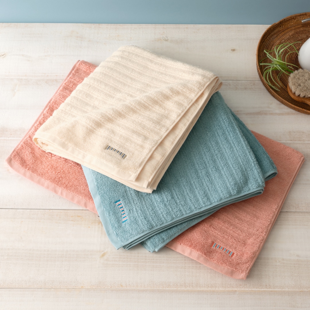 バスタオル・ハンドタオル・バスマットは見た目も楽しいボーダーの織り模様が入り、いつものパイルタオルとは一味違う拭き心地!