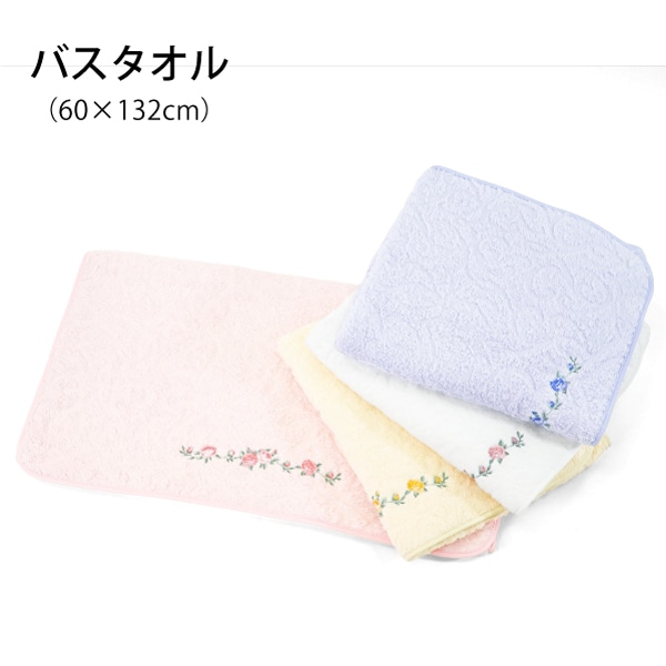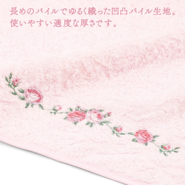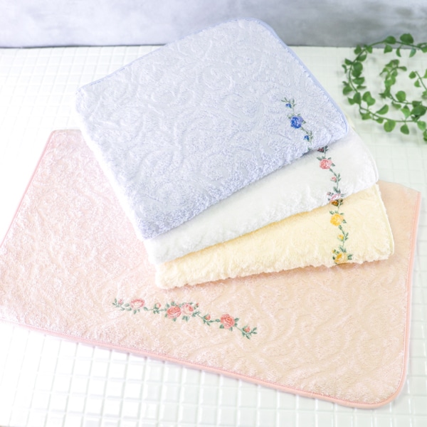 ほどよいふんわり感のアラベスク文様が織り込まれたジャカード織の生地に上品な色合いのバラの刺繍を施しました。可愛らしいバラのワンポイントが、日常にそっと華を添えます。普段使いはもちろん、贈り物にも人気の高いシリーズです。