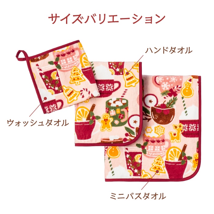 寒い冬に欠かせないホットココアやホットワインにクッキーを添えた、心がほっこり温まるような可愛らしいデザインのタオルシリーズです。