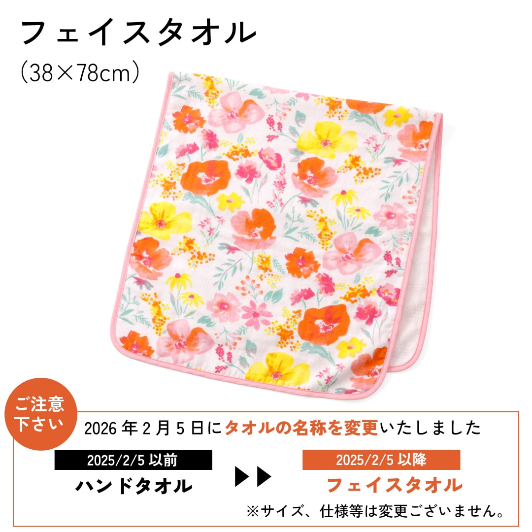 ポピーやミモザをモチーフに、春の訪れを表現したプリント柄シリーズ。 柔らかなピンクをベースカラーに、華やかさと上品さを兼ね備えたトーンに仕上げました。 繊細なプリントが映えるガーゼ面と、ふんわり吸水性の高いパイル面を合わせ持った「表ガーゼ裏パイル」生地は、 使うほどに肌に馴染む、優しい質感も魅力のひとつです。 ご自宅用はもちろん、新生活の始まりや大切な方への贈り物にも 暮らしに春の彩りと心地よさを添えてくれるシリーズです。