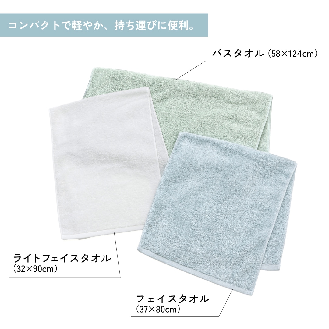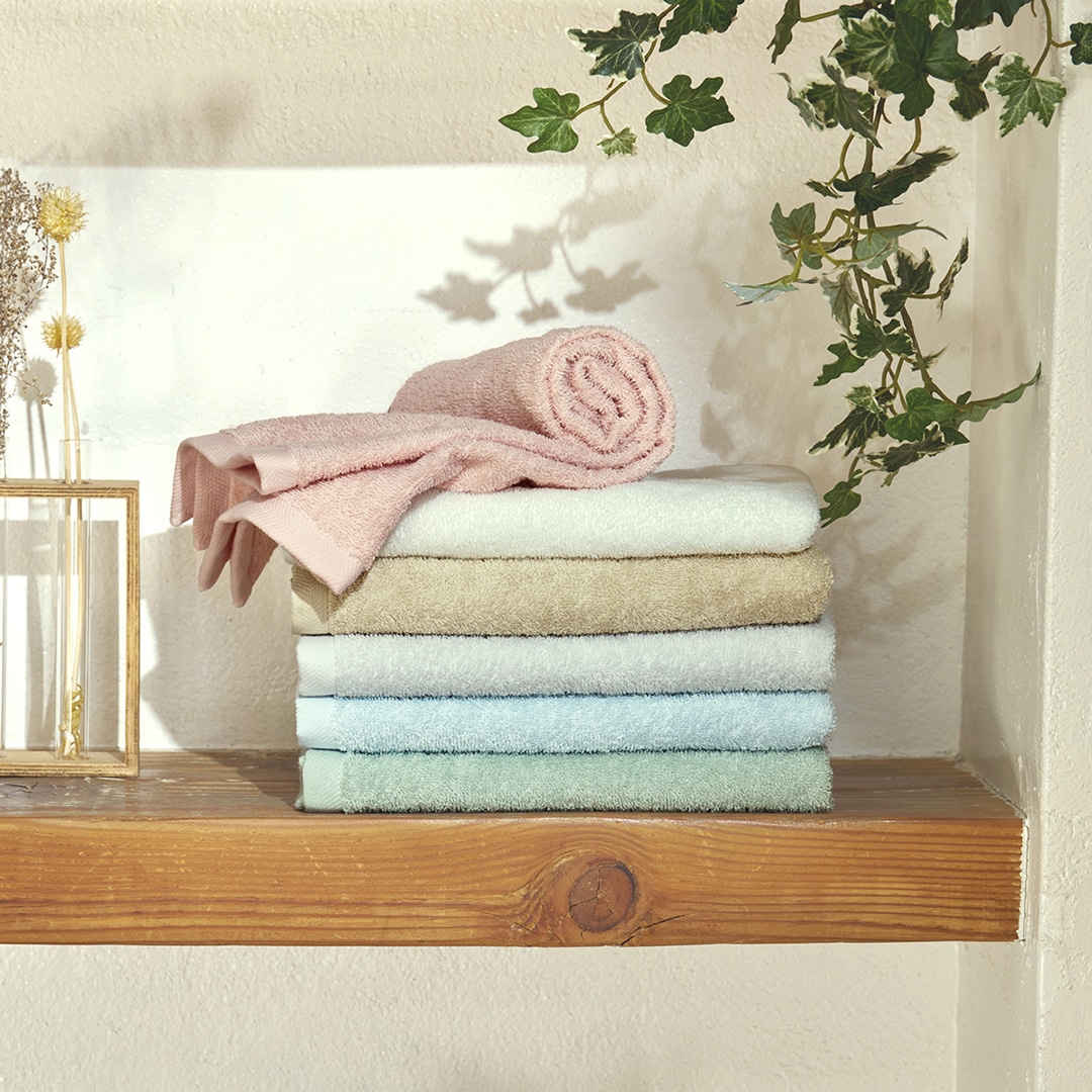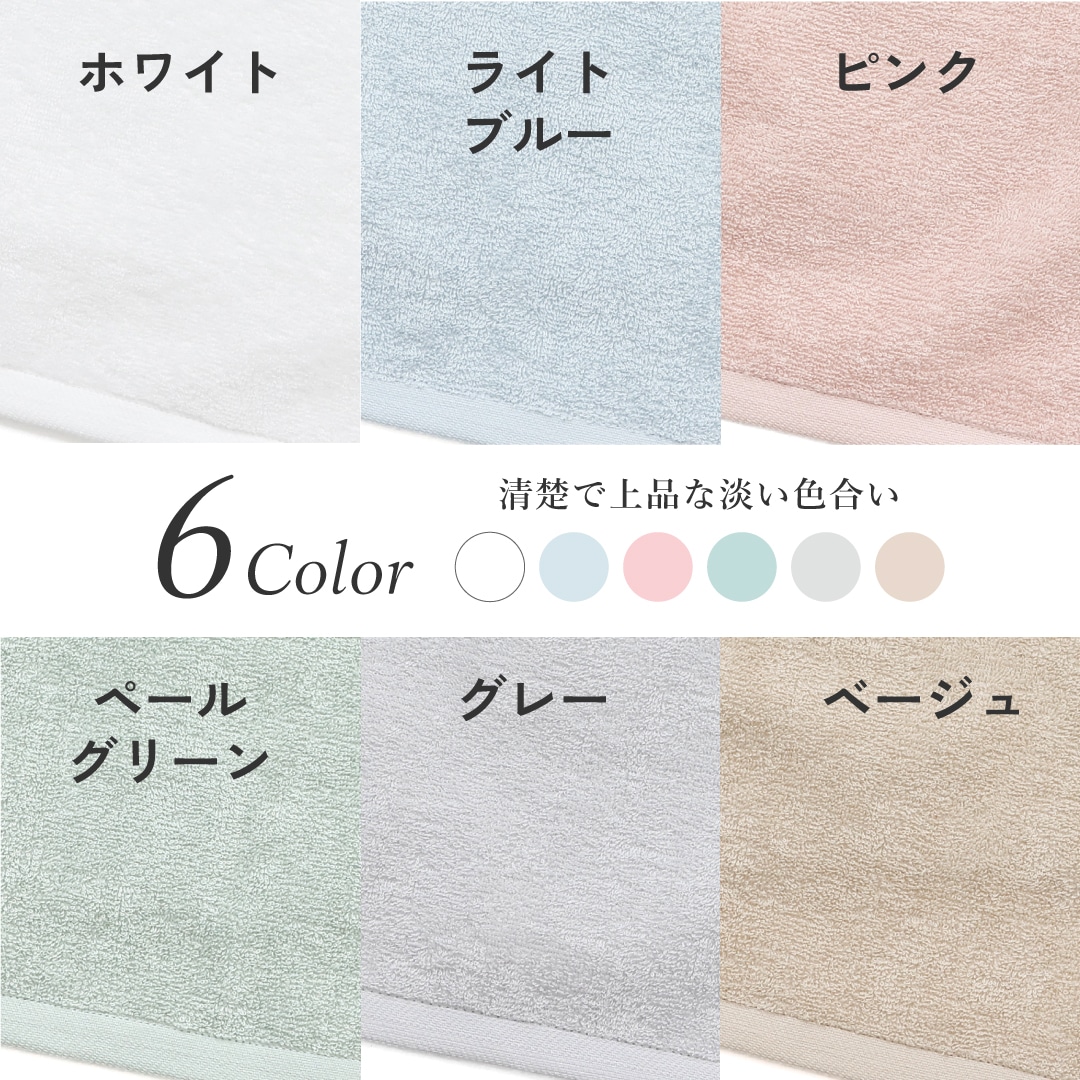サイズを少しコンパクトにして、清楚で上品な淡い色合いを取り揃えた全6色。旅行などにも持ち運びがしやすく、気軽にお使いいただけるタオルです。