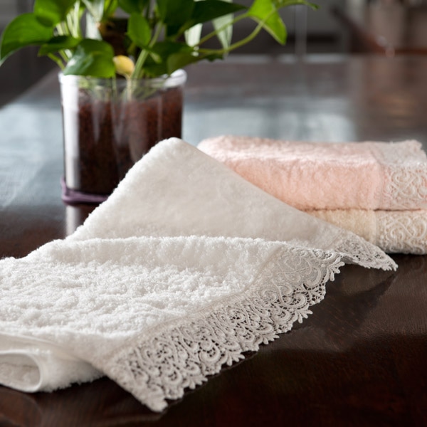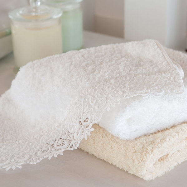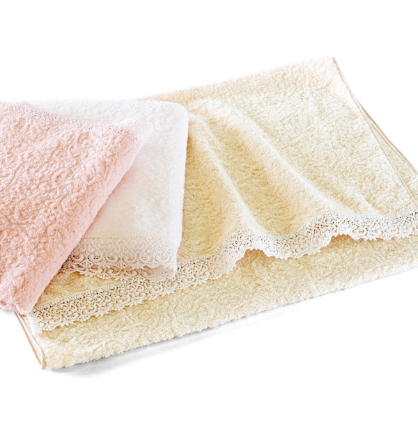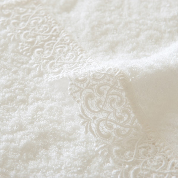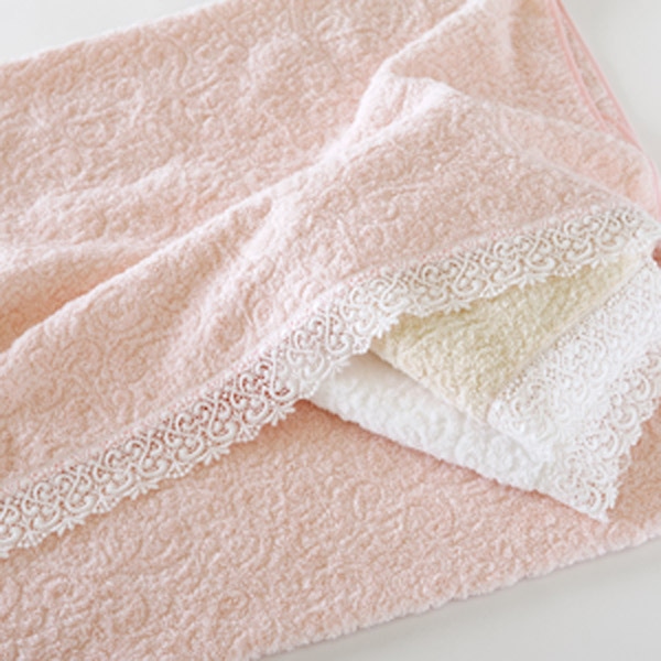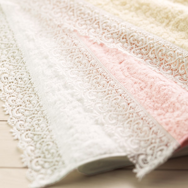 超長繊維綿(ホットマンオリジナルブレンド糸)を使用した、やわらかな風合いのかわいらしいタオル。蔦に実がなり、絡み合う様子を表現した模様のタオルに、繊細で華やかなレースをあしらいました。