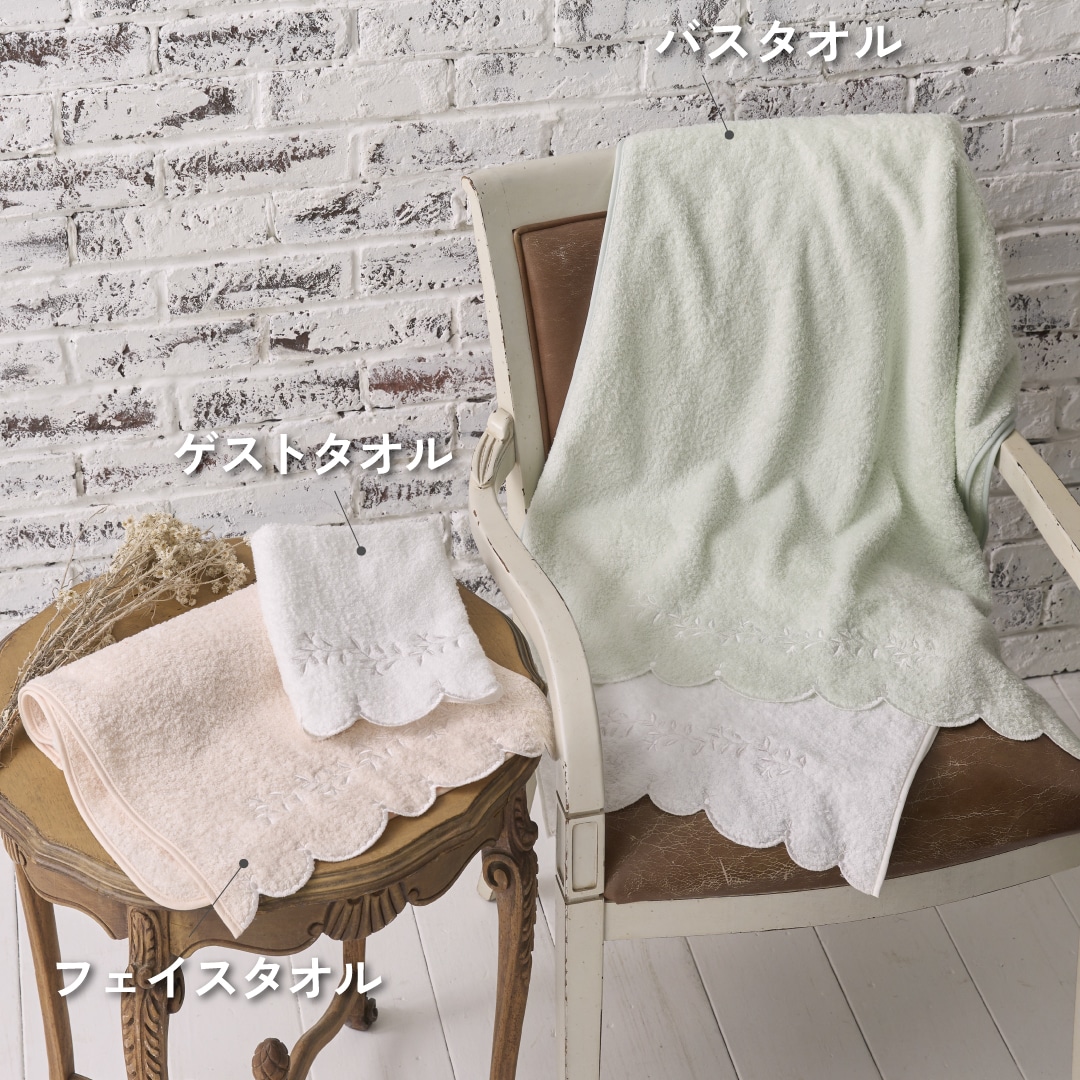 淡く優しい色合いにコットンレースをイメージしたスカラップ刺繍の上品なデザインです。女性らしさや純粋さを表現しました。透き通るような繊細なシャーベットカラーと、甘撚りの糸を使ったふんわり空気を含んだ柔らかいパイルが特徴です。