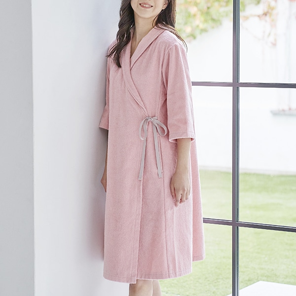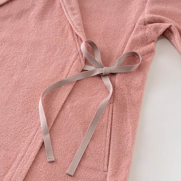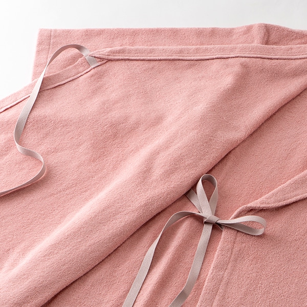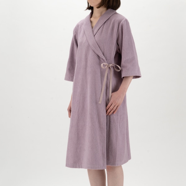 お風呂上りにさっと着られるカシュクールローブ。Aラインのシルエットはゆったりなのにスッキリ見えます。また、薄いパイル地は軽い着心地なうえ、乾きが早く、面倒なお洗濯が時短でできます。内ヒモ付きなので着崩れしにくく、前かがみになっても胸元がはだけにくいので安心です。