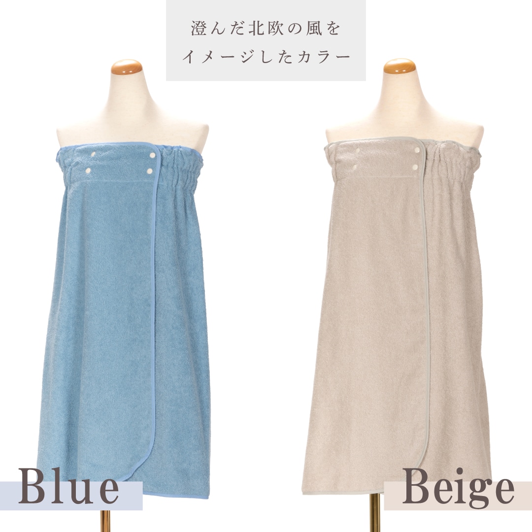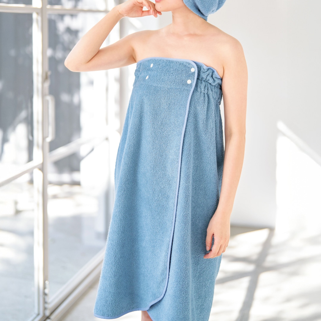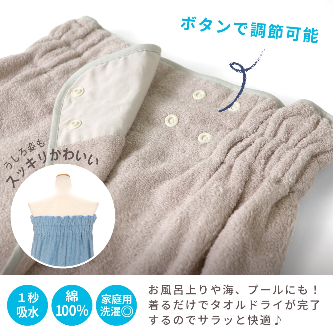 サッと拭いてスナップボタンをパチンと留めるだけの簡単「着るバスタオル」は、お風呂上がりはもちろん、着替え場所の限られる海やプール、サウナ後の外気浴でも活躍します。
