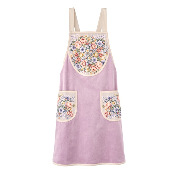 華やかなシェニール織りで胸元とポケットを飾るエレガントなエプロンです。ベースのタオル地は人気の高いブルーグリーンとパープルの2配色。