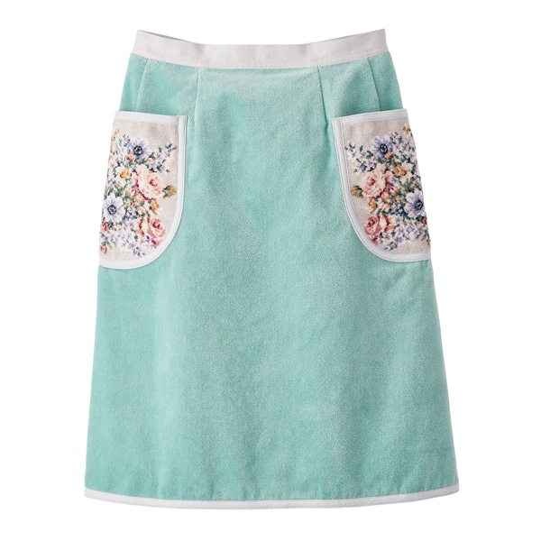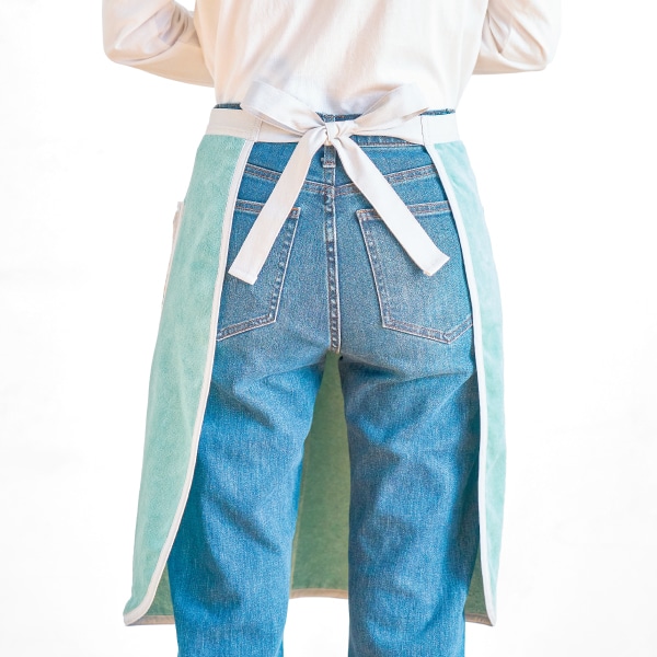 華やかなシェニール織りでポケットを飾るエレガントなサロンエプロンです。ベースのタオル地は人気の高いブルーグリーンとパープルの2配色。