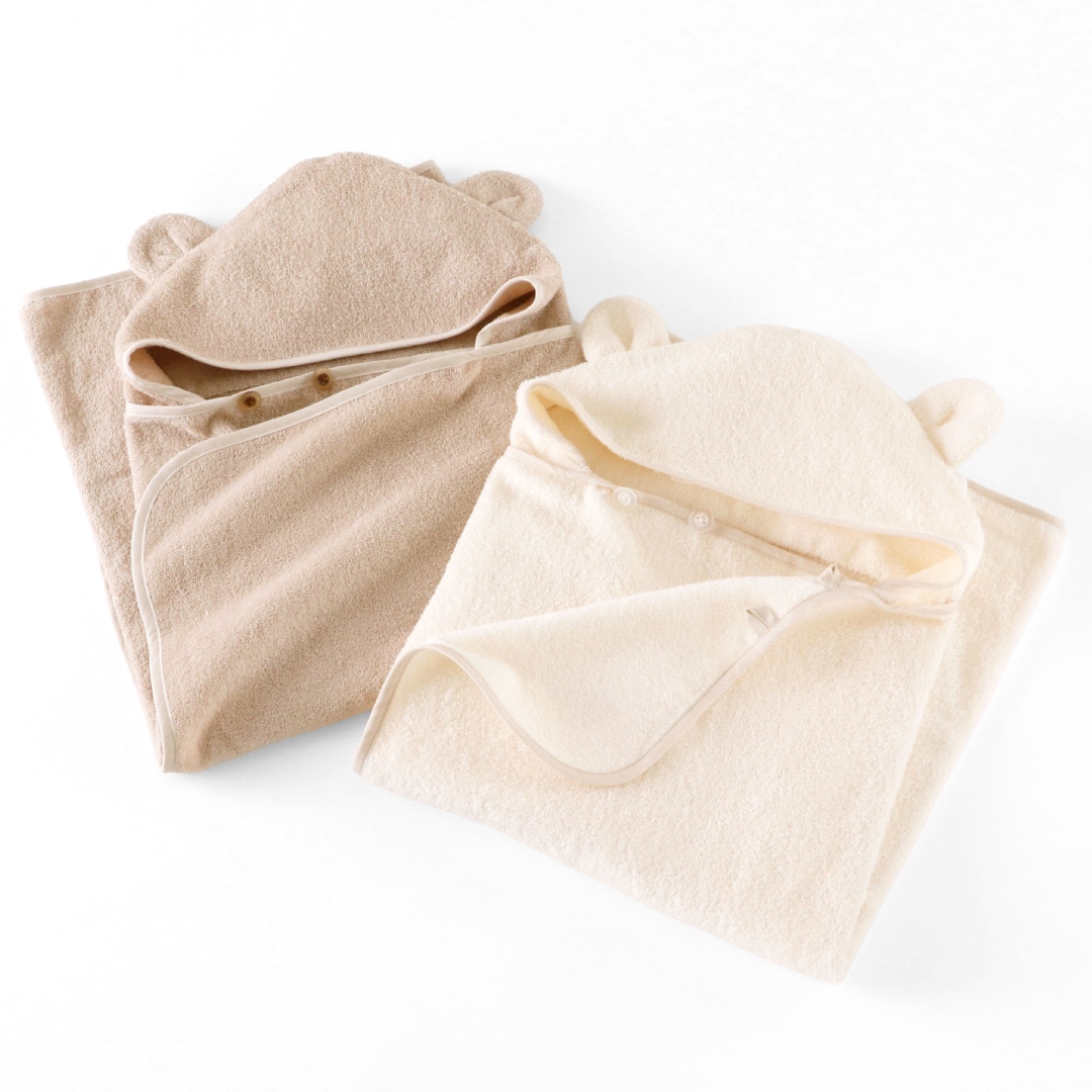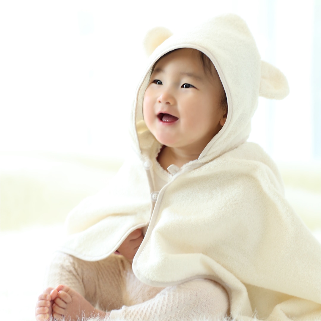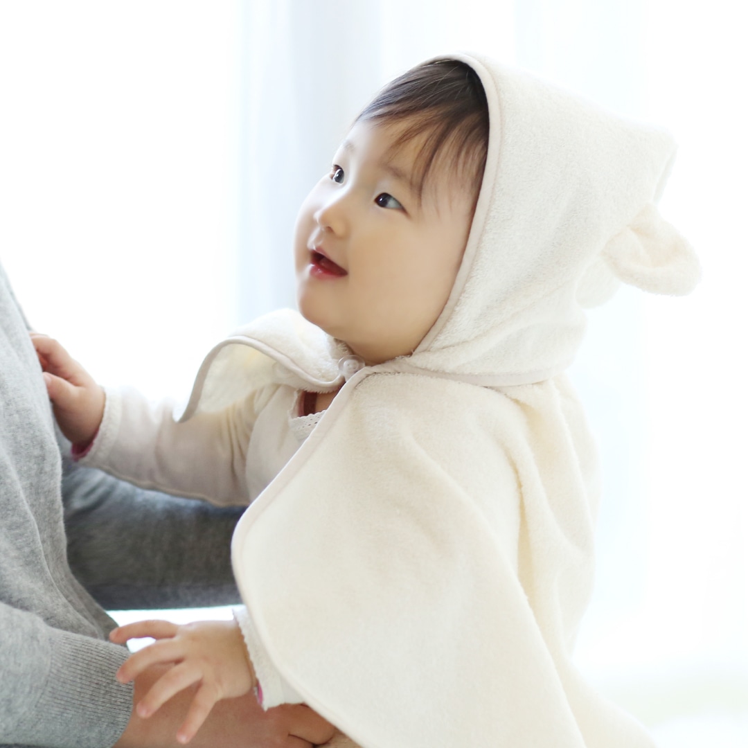 フード部分に可愛いくま耳付きのおくるみです。おくるみとしてお使いいただくだけではなく、沐浴の時やお風呂の時にサッと羽織って湯冷めを防げる便利アイテム。新生児期からあんよができるよちよち期まで月齢を問わないので贈り物にもおすすめです。