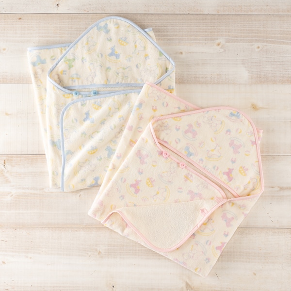 マーシャがたくさんのおもちゃに囲まれ楽しく遊んでいる様子をイメージしたプリント柄のフード付きおくるみです。