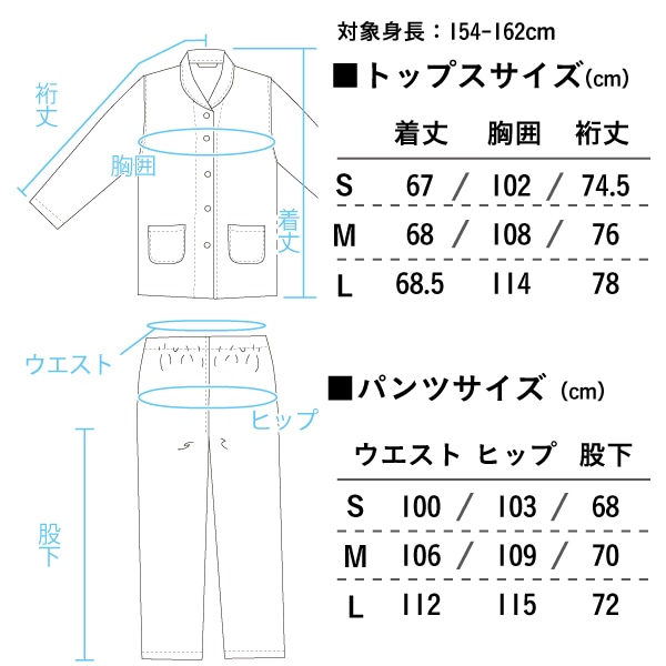 【婦人S*】上着(着丈67cm胸囲102cm裄丈74.5cm袖口16cm)パンツ(ウエスト100cmウエストゴム上がり56cm総丈94.5cm股下68cmヒップ103cmワタリ巾34cm)【婦人M*】上着(着丈68cm胸囲108cm裄丈76cm袖口17cm)パンツ(ウエスト106cmウエストゴム上がり60cm総丈97cm股下70cmヒップ109cm)【婦人L*】上着(着丈68.5cm胸囲114cm裄丈78cm袖口17.5cm)パンツ(ウエスト112cmウエストゴム上がり65cm総丈97.5cm股下72cmヒップ115cmワタリ巾37.5cm)