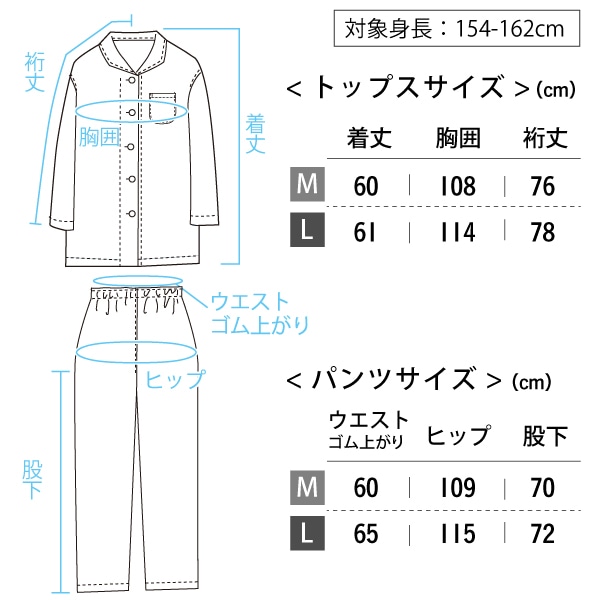 【婦人M*】 上着(着丈60cm 胸囲108cm 裄丈76cm 袖口17cm)パンツ(ウエスト106cm ウエストゴム上がり60cm 総丈97cm 股下70cm ヒップ109cm)【婦人L*】上着(着丈61cm 胸囲114cm 裄丈78cm 袖口17.5cm)パンツ(ウエスト112cm ウエストゴム上がり65cm 総丈99.5cm 股下72cm ヒップ115cm)