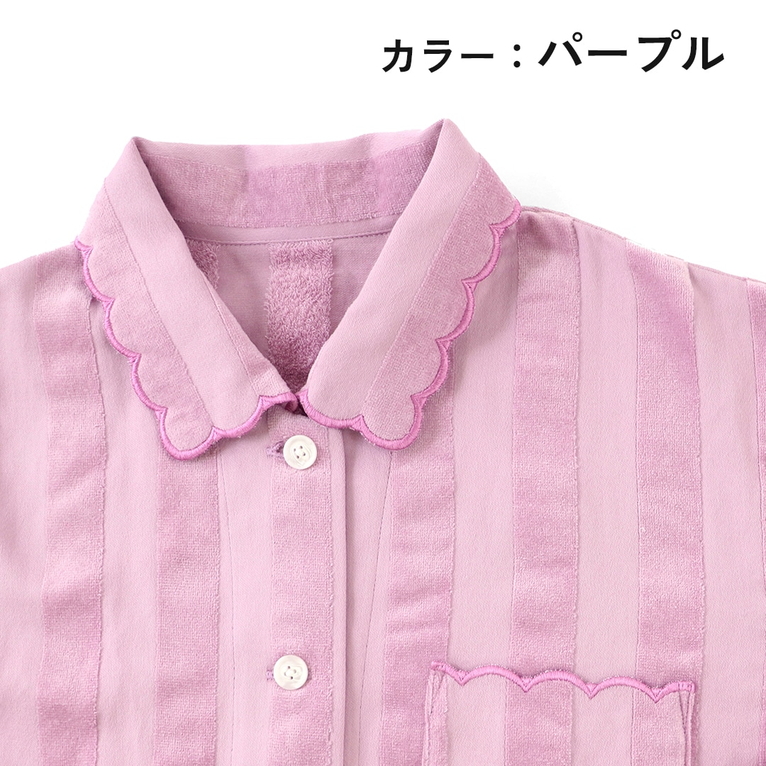 なめらかなシャーリングのタオル地とサテン地を縞状に織った風格あるホットマンならではのオリジナル生地を使った優雅なパジャマ。肌が当たる内側は繊細な糸で織り上げたパイル地です。空気の層ができるので保温性があり、なおかつ寝汗もしっかり吸水してくれる秋冬シーズンにおすすめの逸品。