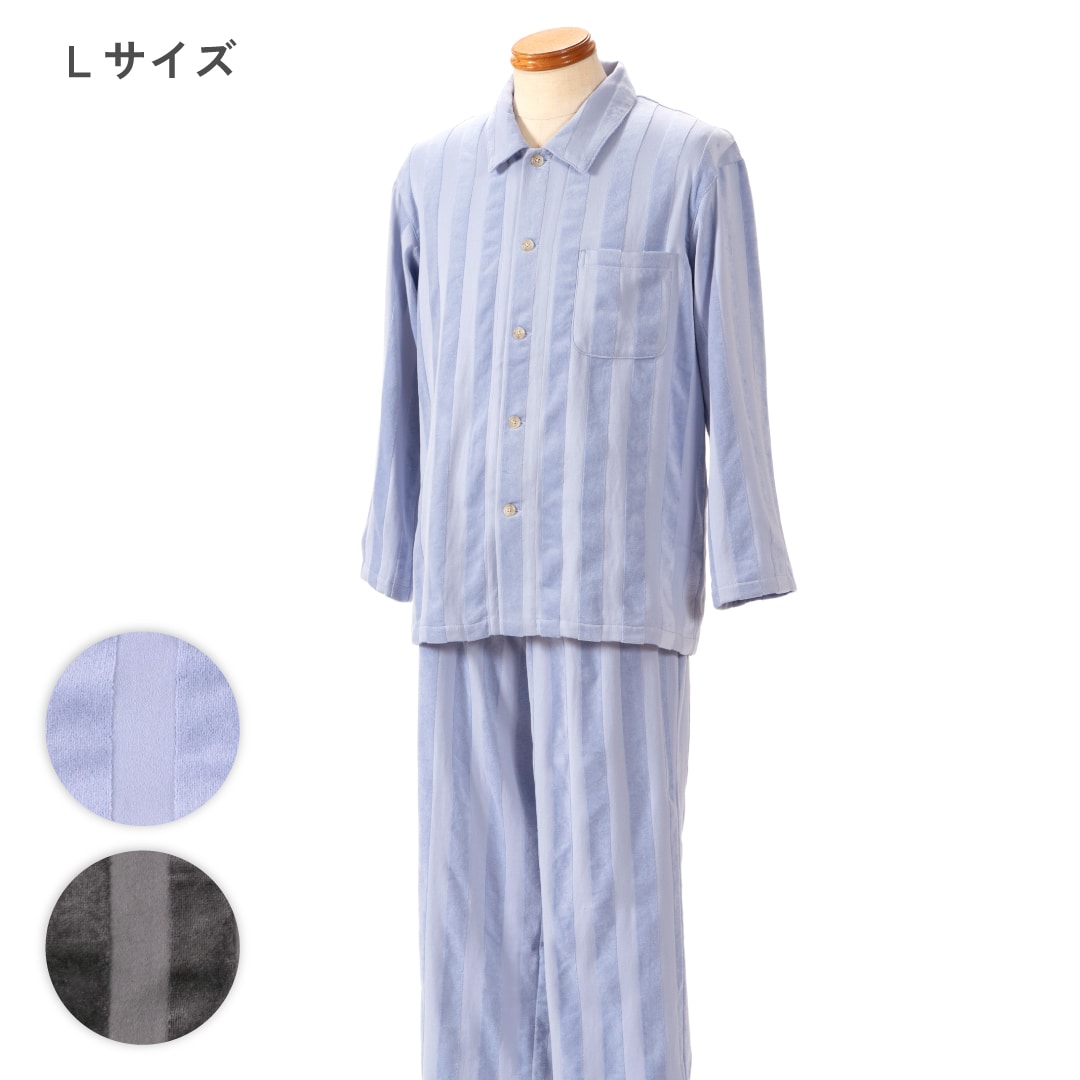 なめらかなシャーリングのタオル地とサテン地を縞状に織った風格あるホットマンならではのオリジナル生地を使った優雅なパジャマ。肌が当たる内側は繊細な糸で織り上げたパイル地です。空気の層ができるので保温性があり、なおかつ寝汗もしっかり吸水してくれる秋冬シーズンにおすすめの逸品。