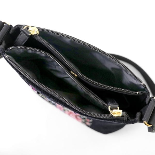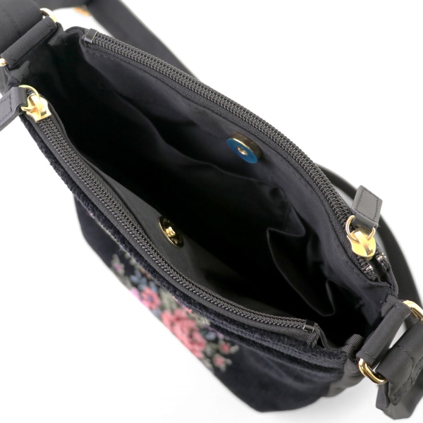 使い易さを考えた多めのポケットに、大切な洋服と擦れにくいように裏側は滑りの良いナイロン生地の工夫されたデザイン。幅広ショルダーは疲れにくく長さを調整でき、斜めがけにもできます。