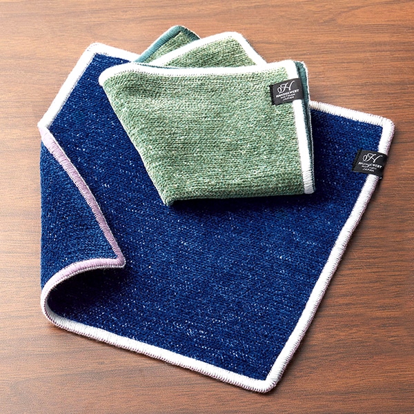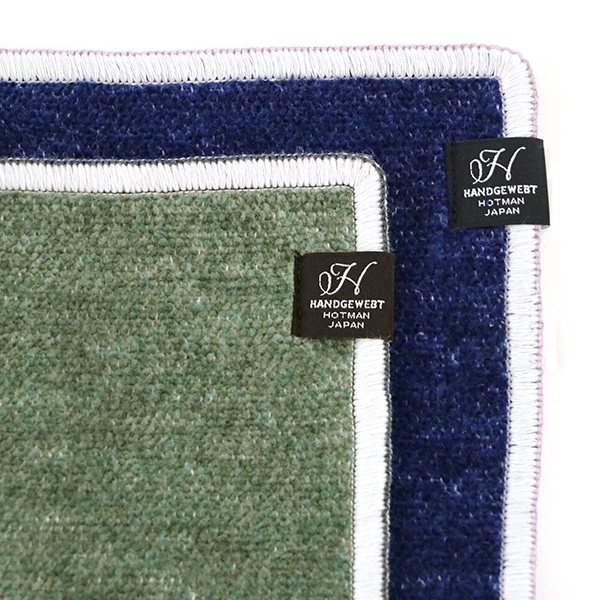 深いネイビーカラーとグレイッシュなグリーンのシンプルなハンカチ。縁どりのカラーが表と裏で異なるアクセントです。