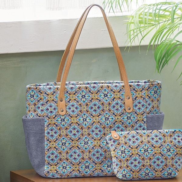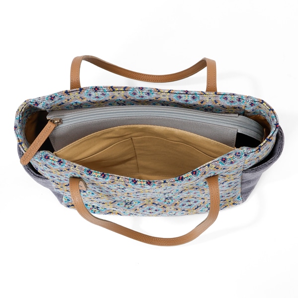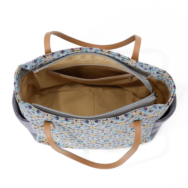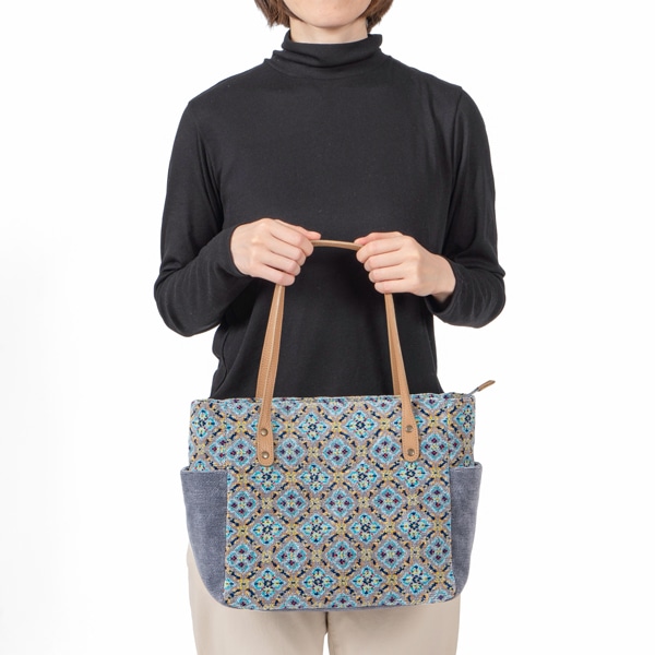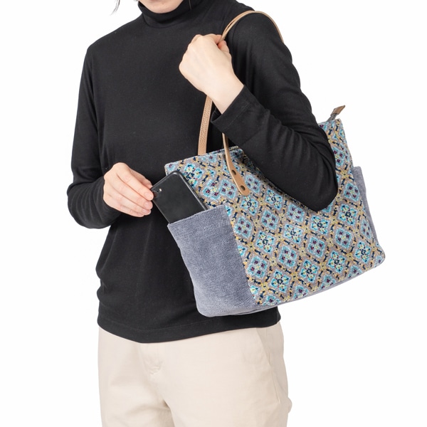 両サイドに便利なポケット付きのトートバッグ。ファスナーを閉めたままでも出し入れができるあおりポケットと、たっぷり収納できるメイン部分はA4ファイルが楽々入るサイズ感です。