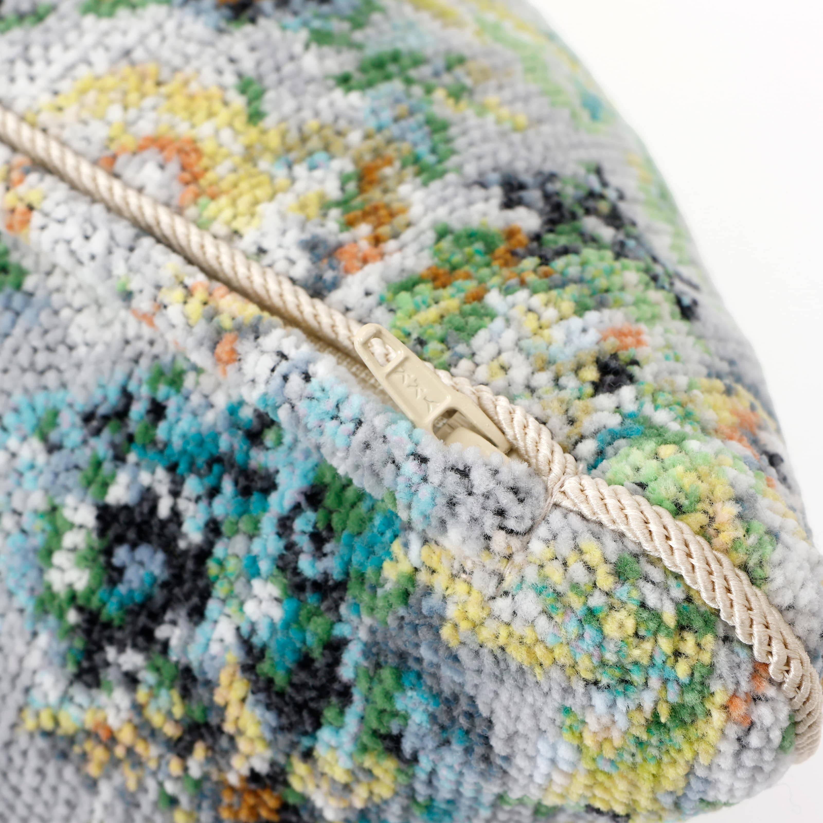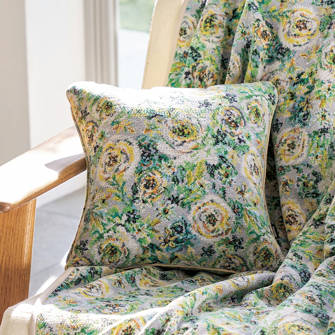 両面総柄のスクエア型シェニールクッション。クッションカバーは取り外しができ、ご家庭でお洗濯が可能です。