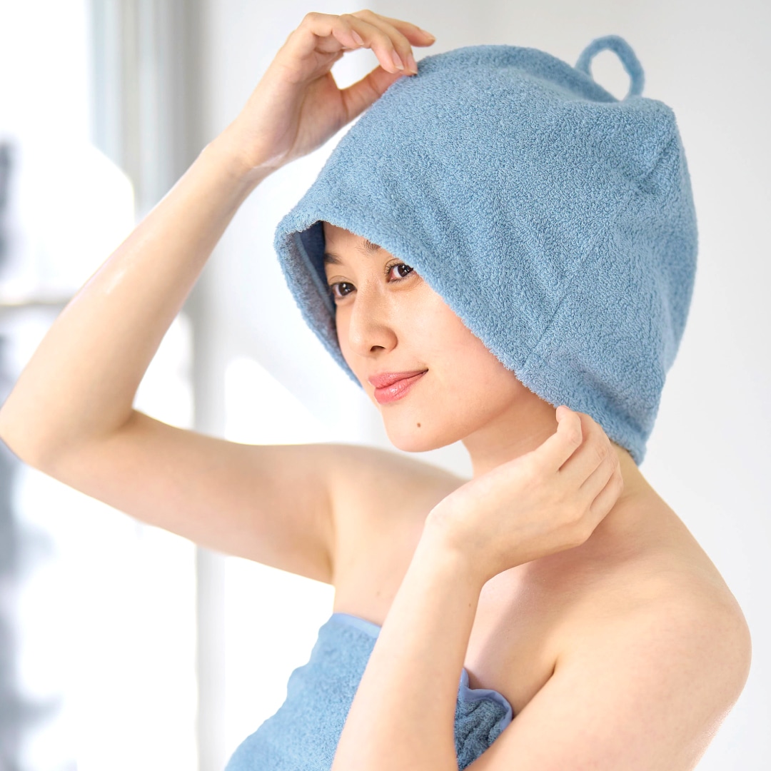 ざっくりとした風合いのタオルで作ったサウナハット。没入感にこだわった口元まで覆える深めサイズ。しっかり汗を吸う薄手の1秒タオル地なのでコンパクトで持ち運びにも便利です。