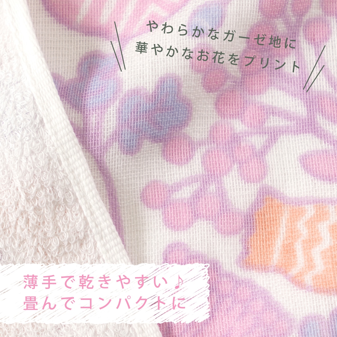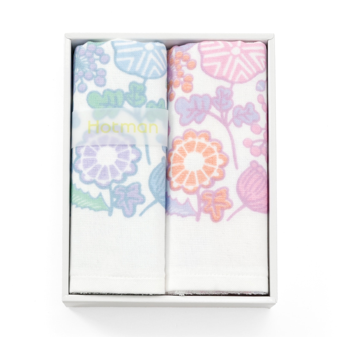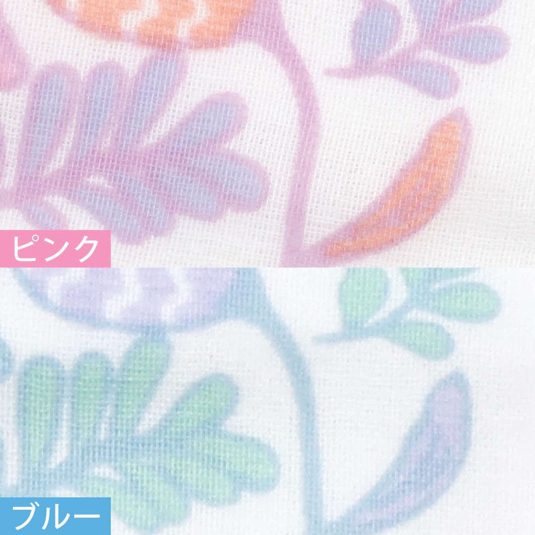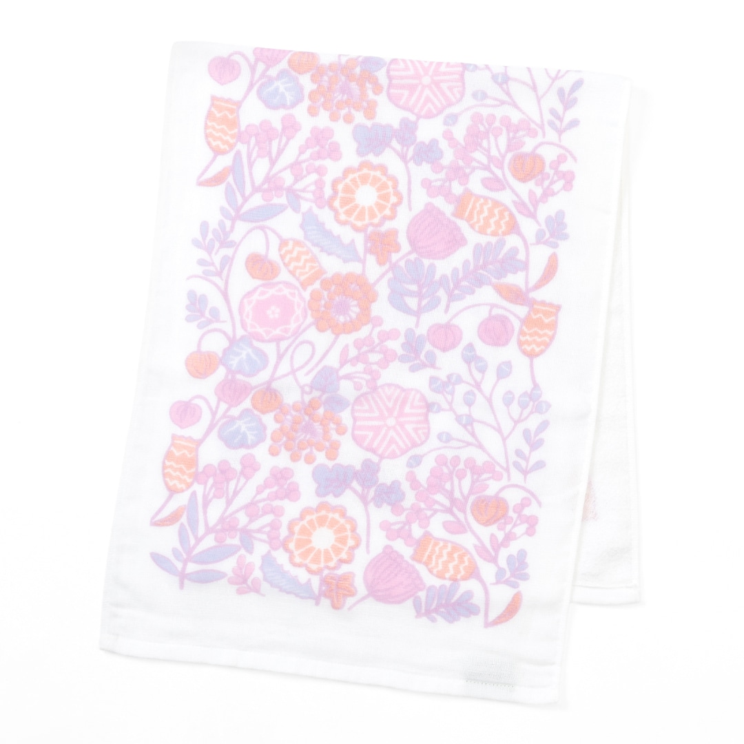 北欧の自然風景をイメージし、一面に咲く野の花をモチーフにしたデザインです。表はガーゼ地、裏はパイル地と異なる風合いが楽しめる薄手フェイスタオル(ブルー・ピンク)の2枚セットです。