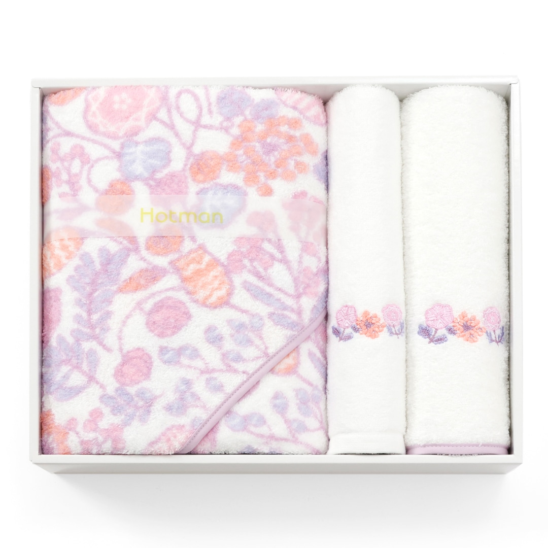 北欧の自然風景をイメージし、野の花をモチーフにした可愛らしいデザインです。使用頻度が高いバスタオルとさりげない可愛らしさのある刺繍フェイスタオルの2枚セット。