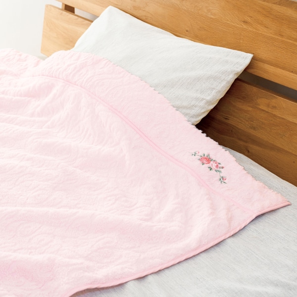 気品あるアラベスク文様の織り模様のタオルケットです。パイル生地のふっくらした風合いが特徴です。